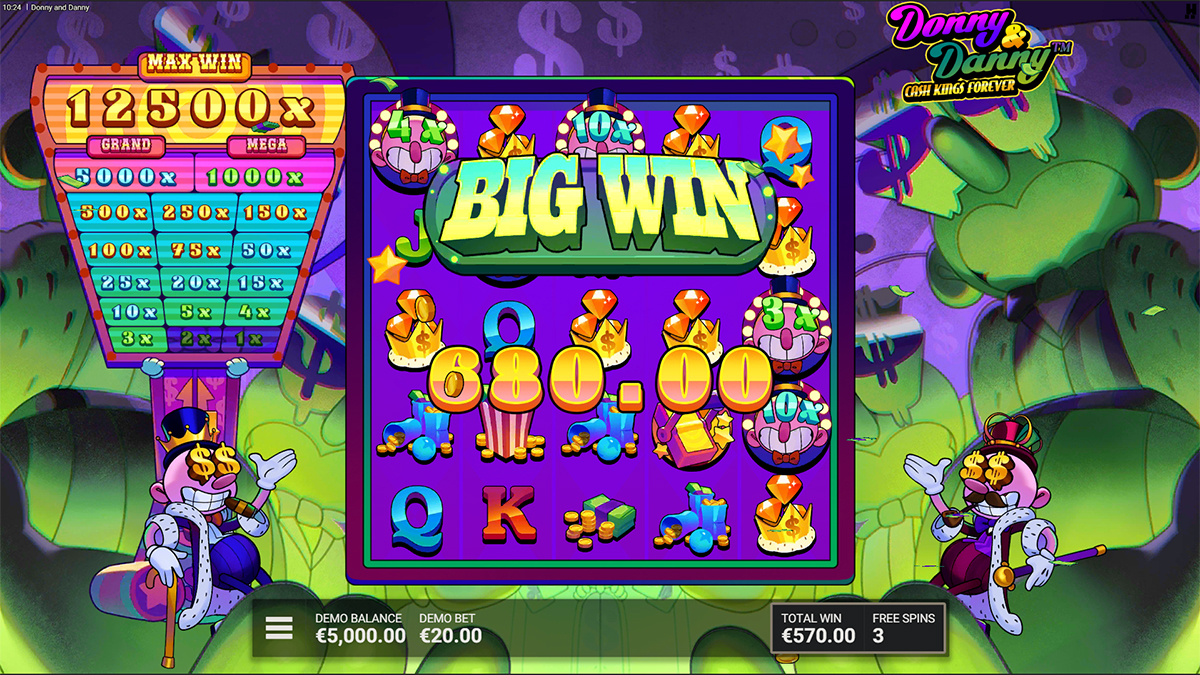 The maximum win in Donny And Danny is capped at 12,500 times your total stake. This top payout is primarily achievable through strong LootLine combinations and enhanced Free Spins features. While rare, the max win potential makes the slot appealing for players chasing high-impact outcomes.