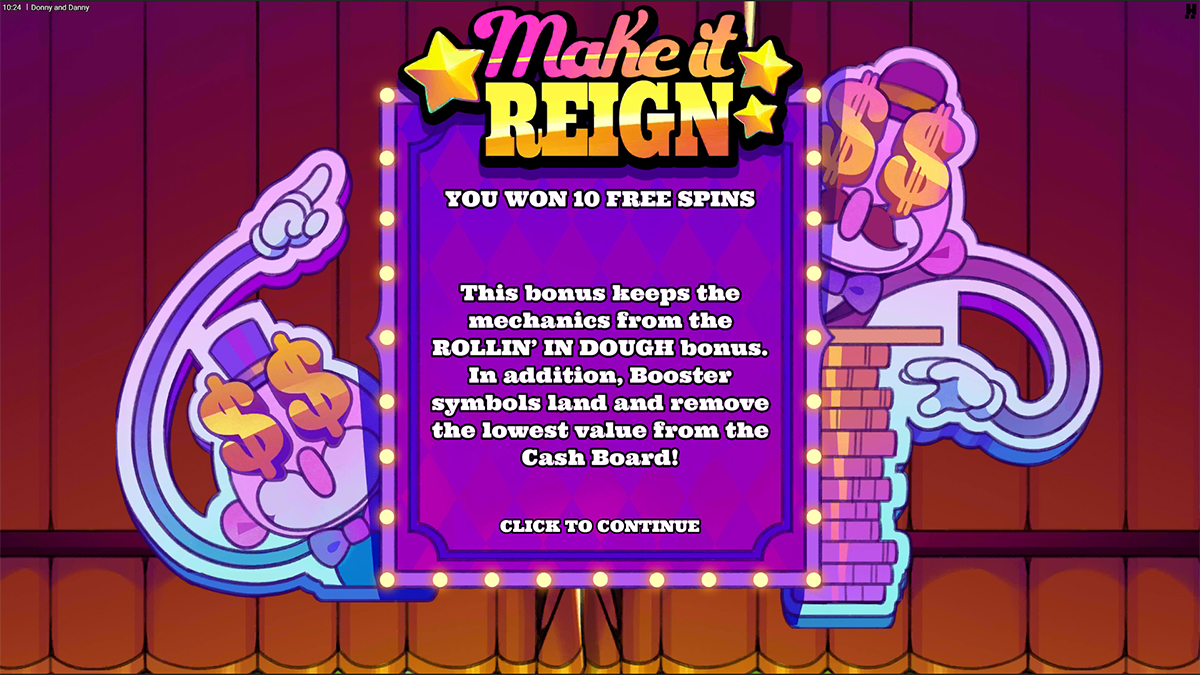 The Free Spins round in Donny and Danny can be triggered by landing FS Scatter symbols, with different quantities unlocking increasingly powerful bonus modes. Three scatters activate the Rollin’ In Dough Bonus Game, awarding 10 free spins with enhanced Donny symbol frequency, while four scatters unlock the Make It Reign Bonus Game, which introduces Booster symbols that permanently remove low Cash Board values. Landing five scatters grants access to the Cash Kings Forever Hidden Epic Bonus, where the final spin guarantees a full grid of Donny symbols for a massive LootLine payout. Across all free spin modes, additional scatters can award extra spins, ensuring that momentum can continue building throughout the feature.
