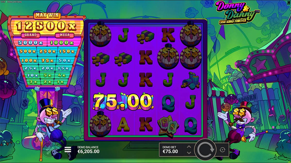 Donny and Danny offers a flexible betting range that caters to both cautious players and high rollers, with wagers starting as low as 0.1 and scaling up to a maximum of 75 per spin. This wide range allows players to tailor their risk level while still having access to the same core features and maximum win potential. For example, at the minimum bet of 0.1, hitting the maximum win of 12,500x would result in a payout of 1,250, whereas the same max win at the highest bet of 75 would produce a substantial 937,500 return. This scalability ensures that the slot remains equally exciting at different stake levels, as the proportional reward structure keeps the dream outcome consistent regardless of bet size.