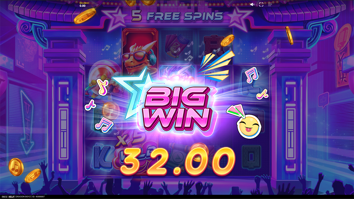 The maximum win in Dragon Boyz is capped at 20,000 times your selected bet. If a round reaches this limit, the game immediately ends and awards the full capped amount. Any remaining bonus spins are forfeited once the 20,000x threshold has been achieved.