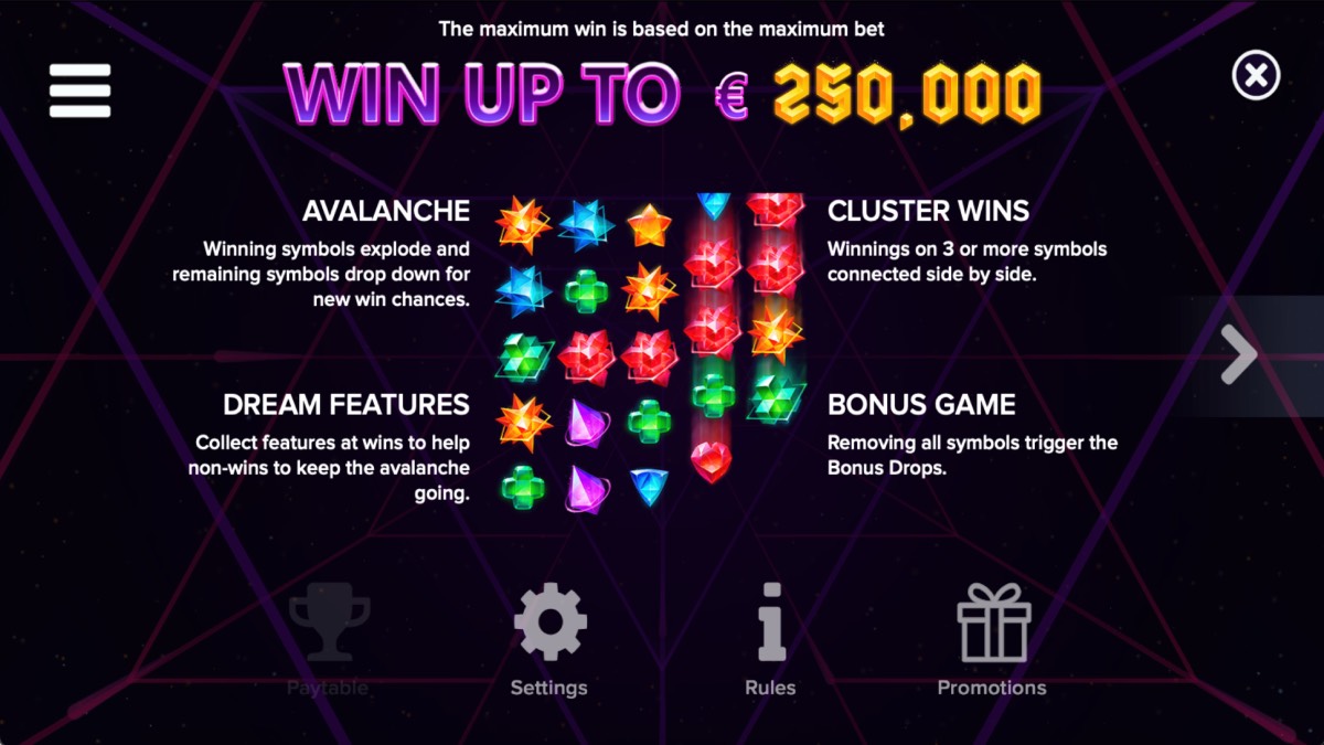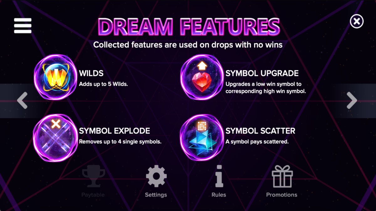 Dream Features | Special symbols collected during wins, including Wilds, Symbol Explode, Symbol Upgrade, and Symbol Scatter. These can activate on non-winning drops to extend avalanches and boost win potential. |
