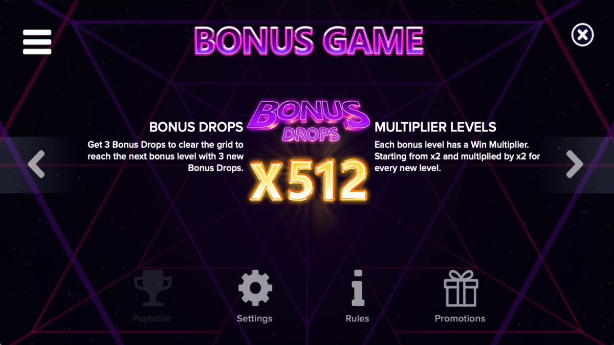 Free Drops Bonus | Starts with 3 free drops and a Win Multiplier of x2. Clearing the grid advances levels and doubles the multiplier, potentially reaching up to x512. |