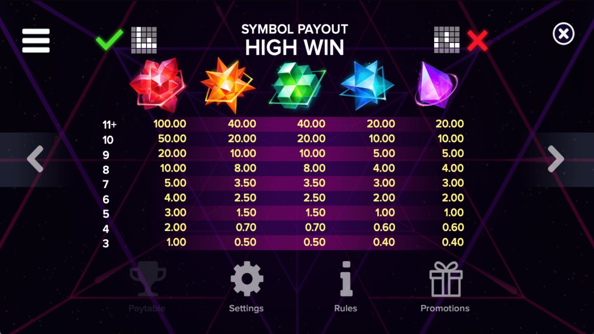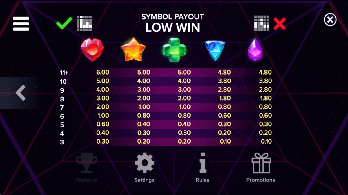 The reels are populated with a variety of gem symbols, each distinguished by unique shapes and vibrant colors. These visually striking icons form the core of the game’s aesthetic, offering straightforward matching combinations that determine wins. While the symbols themselves are simple in concept, their bright and polished design adds a layer of visual appeal, making each spin engaging and easy to follow for players as they aim to align winning combinations.