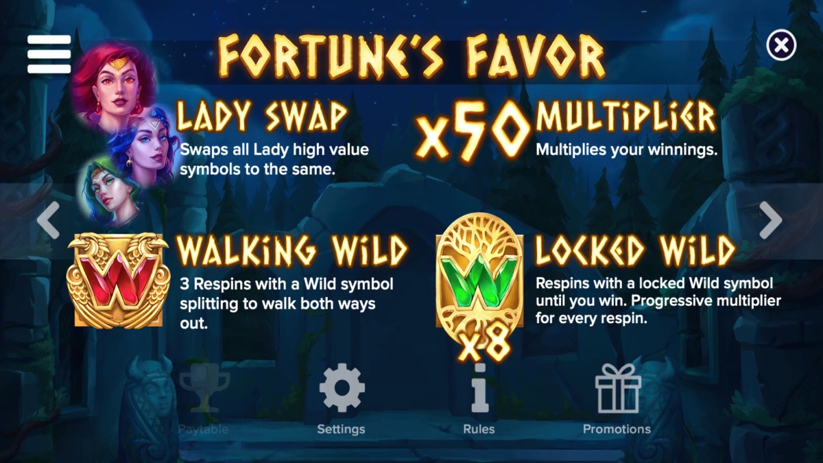 Fortune’s Favor | Activates randomly during a spin, adding one of several effects: symbol swap, Walking Wild, Locked Wild, or a win multiplier. |