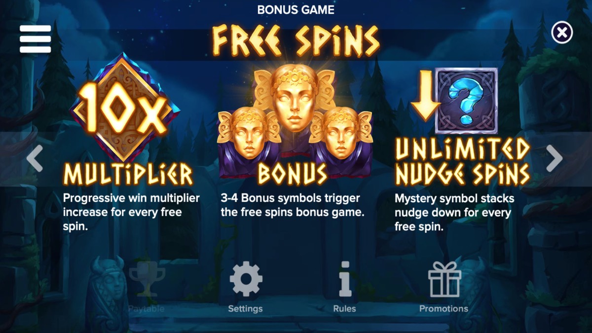 The free spins mode in this slot title is triggered by landing 3 or more scatter symbols anywhere on the reels. When activated, players receive Mystery Stacks—one for three scatters and two for four—that appear on any reel except the middle one. During the free spins, these Mystery Stacks move, or “nudge,” one position down per spin and transform into a randomly selected matching pay symbol. This process continues as long as there are Mystery Stacks on the reels, effectively giving players unlimited spins for the duration of the feature. A progressive win multiplier actually increases by +1 for each nudge, and any active Fortune’s Favor multipliers are applied on top of this, amplifying potential payouts significantly. The combination of nudging Mystery Stacks and progressive multipliers makes this feature both dynamic and capable of generating substantial wins.