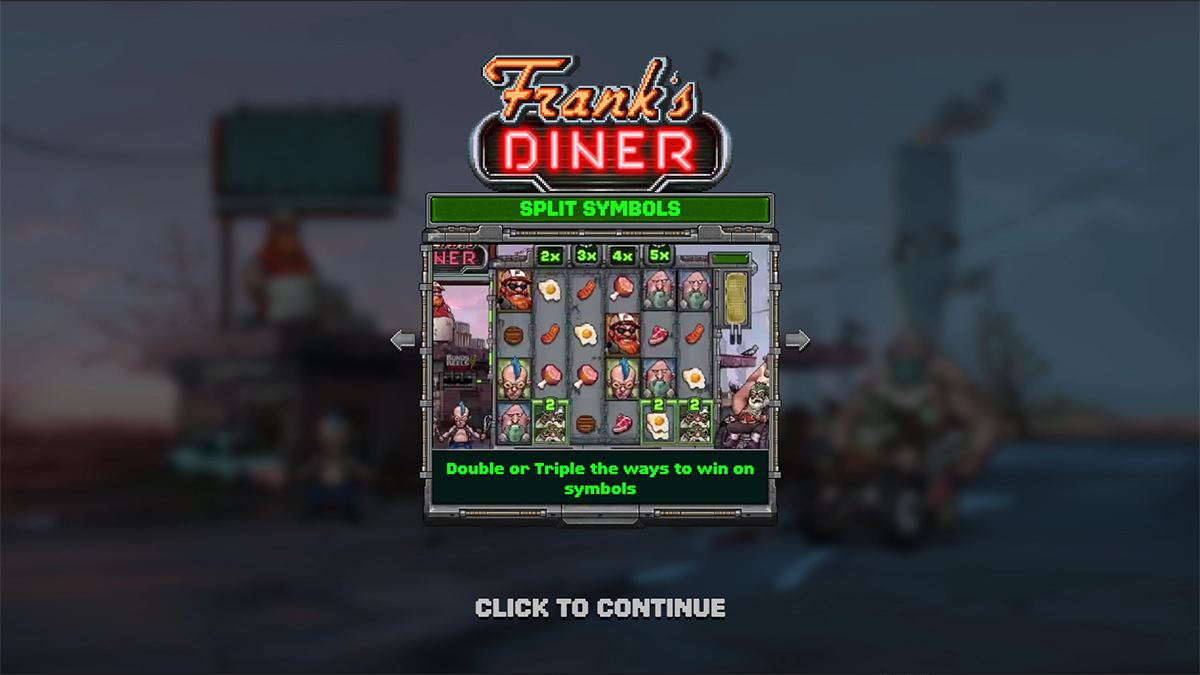 The gameplay in Frank’s Diner is structured around a 6-reel, 4-row setup that provides 4,096 ways to win, ensuring an engaging experience on every spin. Wins occur when matching symbols land from left to right on adjacent reels, triggering cascades that remove winning icons and drop new ones into place for potential chain reactions. This cascading system keeps the action fast-paced and continuous, allowing for multiple wins on a single spin. The atmosphere is enhanced by the diner’s gritty visuals and quirky animations, making each win feel like a small victory in a chaotic world. Features like Split Symbols and Golden Wilds add complexity, turning standard spins into thrilling sequences where symbols morph, multiply, and respin for enhanced rewards.