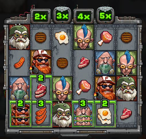 The low-paying symbols consist of a selection of greasy, comfort-food classics: eggs, sausages, steaks, patties, and slabs of meat. These icons align perfectly with the diner theme, representing the culinary staples of this strange roadside establishment. Though they pay smaller amounts—ranging from 0.5x to 1x for five-of-a-kind—their frequency on the reels ensures steady, incremental payouts. Combined with the cascading win mechanic, these symbols help maintain player engagement, often triggering chain reactions that lead to higher-paying combinations. Their visual simplicity also complements the pixelated aesthetic, contributing to the game’s nostalgic yet gritty charm.