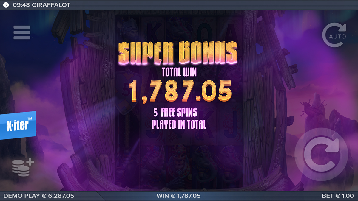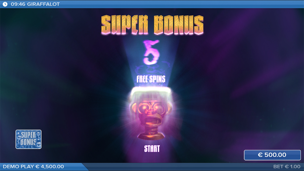 The Free Spins round in Giraffalot is triggered by landing three Bonus symbols on reels 1, 3, and 5, initiating the Bonus Game with five free spins. If one of these triggering icons is a Super Bonus symbol, the enhanced Super Bonus Game is awarded instead. During regular Free Spins, all base features remain active, allowing Expanding and Spreading Wilds to generate chain reactions of wins. In the Super Bonus version, players are guaranteed between one and four Expanding Wilds on every spin, creating massive win potential. These rounds are where the slot’s full power unfolds, often turning a simple bonus trigger into an exhilarating display of interconnected features and high-multiplier rewards.