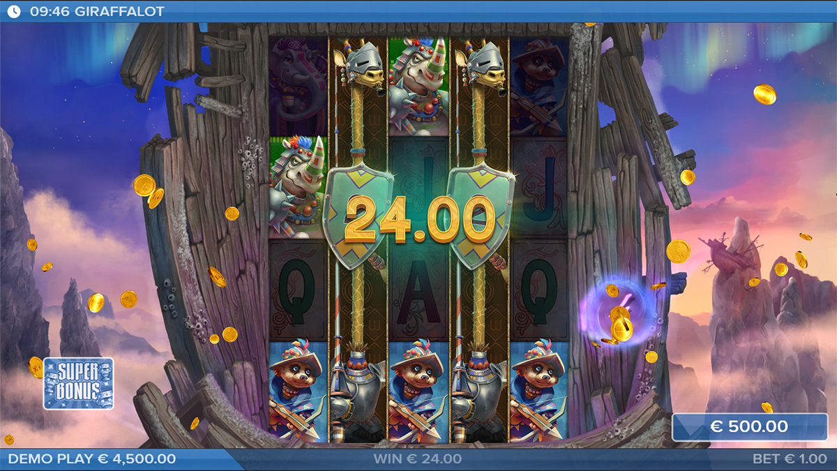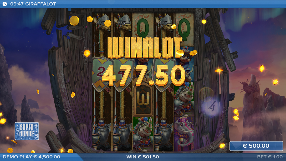 Giraffalot’s special symbols are the true catalysts for excitement. The Expanding Wild, represented by the giraffe knight himself, can cover entire reels and grant respins while potentially carrying multipliers. The Spreading Wild, depicted as ornate gates, transforms nearby symbols or increases multipliers for enhanced rewards. Lastly, the golden chalice Bonus symbol unlocks the path to the Bonus and Super Bonus Games when three or more appear on reels 1, 3, and 5. These symbols inject unpredictability and magic into the gameplay, turning ordinary spins into extraordinary opportunities for major wins.