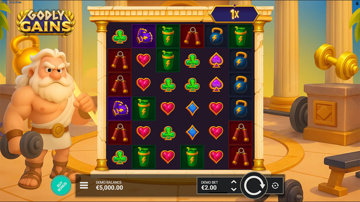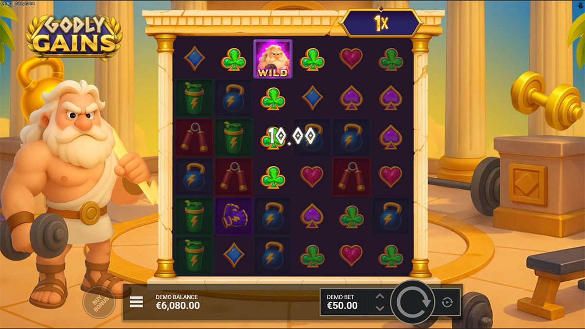 The gameplay in Godly Gains revolves around a cascading cluster pay system played on a 6×6 grid, which gives players a break from traditional paylines and instead rewards them for connecting clusters of five or more identical symbols. Every time a winning cluster forms, the symbols vanish, allowing new ones to drop down and potentially create more winning combinations within the same spin. This chain reaction of cascading wins keeps the action flowing and amplifies the excitement, especially when boosted by global multipliers or wild additions. The theme’s fitness concept is cleverly integrated into the gameplay — Zeus himself pumps up the reels as wilds and multipliers build, enhancing the sense of progress and momentum as each cascade unfolds. This fast-paced structure ensures a continuous sense of reward, blending humor, tension, and dynamic engagement in every round.