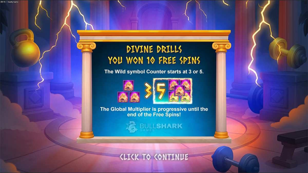 The free spins feature in Godly Gains is the heart of the game’s bonus experience, triggered by landing three or more scatters. Three scatters activate the Glorious Grind round with 10 free spins, where the Global Multiplier becomes progressive, and every God Mode symbol adds wilds to the grid. Landing four scatters triggers the Divine Drills bonus, also awarding 10 free spins but with a higher Wild Symbol Counter starting at 3 or 5, creating an even more explosive potential. During free spins, the multipliers and wild additions accumulate until the round ends, allowing exponential growth and thrilling gameplay. Additional scatters during the feature award extra spins, maintaining the tension and excitement throughout.