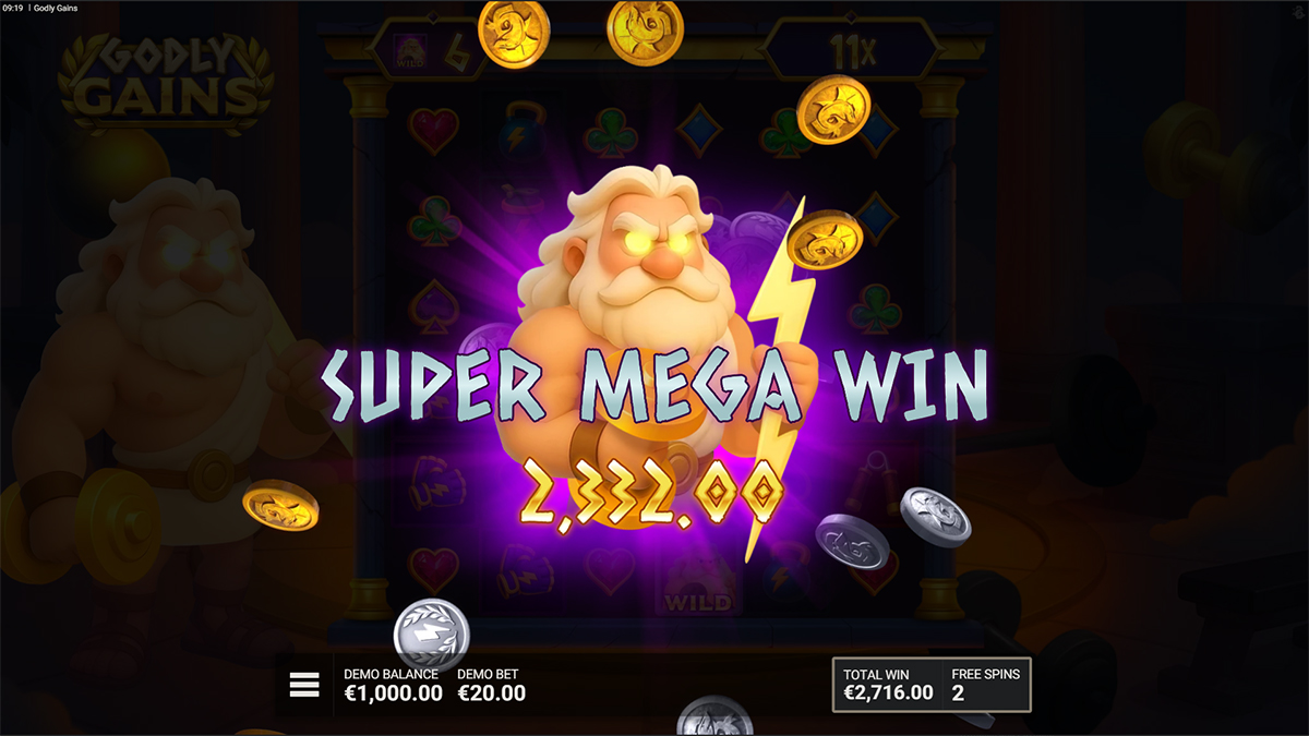 Godly Gains operates with a solid mathematical foundation, combining cluster pay mechanics with global multipliers and layered symbol functions that create deeply interactive play sessions. The slot’s balance between the base game and bonus rounds ensures that even without free spins, the God Mode symbol can trigger excitement by adding wilds or multiplying winnings significantly. The cascading system creates a rolling flow of potential, where each cascade may trigger another — making even a single spin capable of chaining several wins together. The presence of progressive counters during the free spins enhances the feeling of climbing toward greatness, echoing the slot’s workout theme. Each spin feels muscular, as if building up toward an epic finish — an intentional mechanical rhythm that mirrors the godly training motif perfectly.