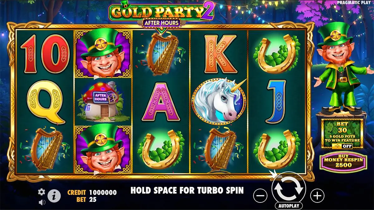 The high-paying symbols in Gold Party 2 – After Hours are themed beautifully around Irish folklore and include a mushroom, a golden horseshoe, a majestic unicorn, and the festive Leprechaun. These symbols award between 1x and 4x the bet when landing five of a kind on a payline. The Leprechaun symbol is particularly valuable not only for its payout but also for its role in triggering the Copy Reels feature, which has the potential to fill the grid with top-value symbols for significantly boosted rewards.