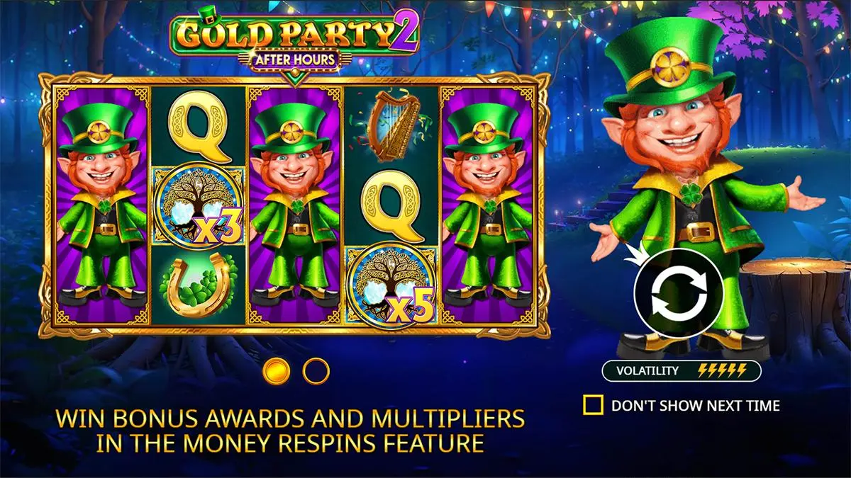 Gold Party 2 – After Hours runs on a classic 5×3 reel setup with 25 paylines, offering a straightforward base game experience that serves as the stage for its more elaborate bonus content. Wins are formed by landing three or more matching symbols on adjacent reels, starting from the leftmost reel. During the base game, you'll encounter random enhancements like Copy Reels, where the highest-paying Leprechaun symbol stacks on reel 1 and duplicates across other reels, creating massive win potential. The base game is fast-paced thanks to a 32.05% hit frequency, ensuring that small to moderate wins occur frequently enough to keep the experience engaging. The inclusion of Wild Multipliers spices up the payouts further, while the feature-rich bonus rounds provide the game's most thrilling moments.