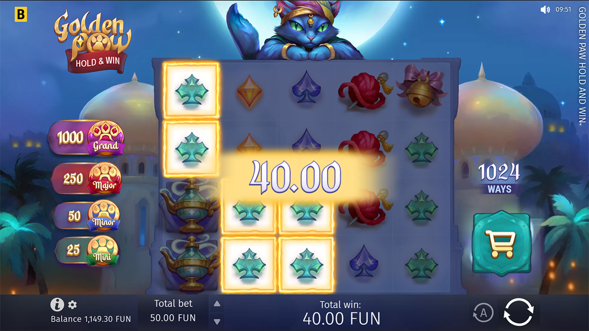Golden Paw Hold & Win ultimately delivers a charming and engaging experience that blends atmospheric visuals with a feature-focused core centered around the expanding Hold & Win mechanic, creating a memorable journey that feels both calming and rewarding as players ascend toward the moonlit jackpots. Its Arabian-inspired setting, complete with mystical blue-cat guardians and treasure-laden symbols, transforms each session into a thematic adventure supported by smooth gameplay and intuitive design choices. The expanding grid, which grows from 4 to 8 rows during the bonus round, adds a sense of progression that elevates the entire feature above the standard Hold & Win format. By shifting emphasis away from free spins and instead focusing on building momentum through coin collection, the game carves its own identity within the genre. While the maximum win of 1000× may be modest compared to ultra-high-volatility titles, the balanced math model and evolving bonus structure make it appealing to a wide range of players looking for an enjoyable, consistent slot experience. Altogether, Golden Paw Hold & Win succeeds as an accessible, visually rich, and mechanically satisfying slot that offers steady entertainment and a refreshing twist on familiar mechanics.