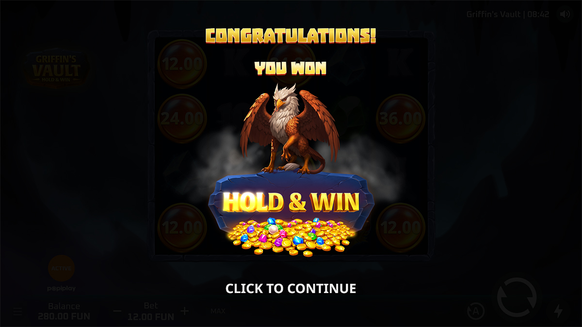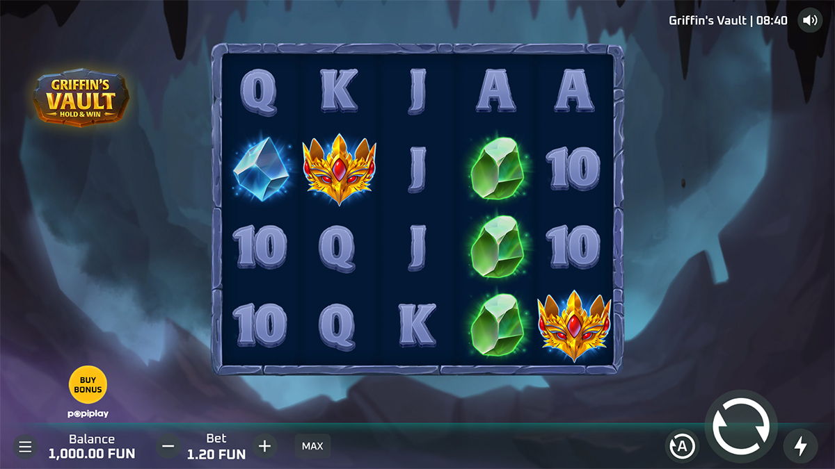 Griffin’s Vault does not include a traditional free spins bonus round. Instead, the main bonus experience centers around the Hold & Win feature with respins. This mechanic delivers a similar level of excitement and reward potential without a standard free spins format.