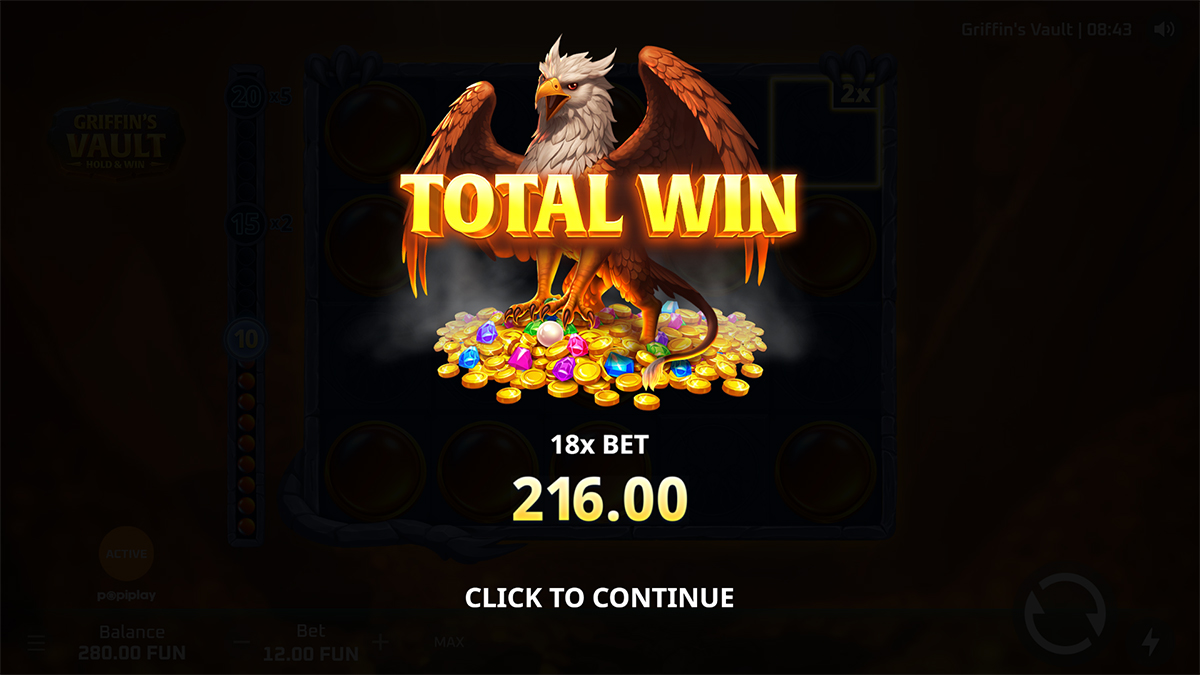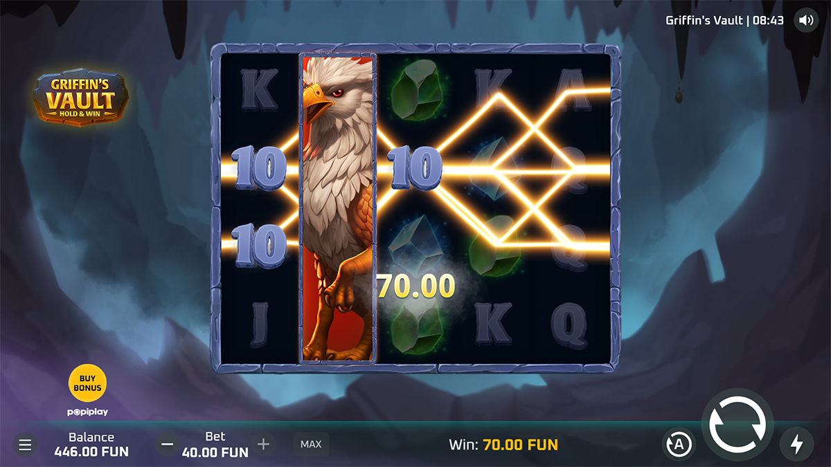 The maximum win in Griffin’s Vault is capped at 5,000 times your total stake. This top prize can typically be achieved through a strong Hold & Win sequence combined with multipliers. Landing the full potential at higher bet levels can result in a very substantial payout.