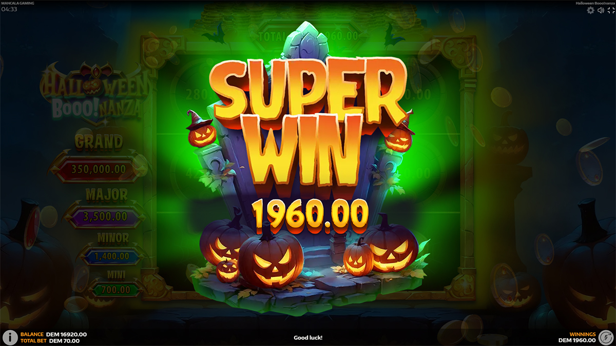 Volatility in Halloween Booo!nanza is classified as very high, making it a slot built for thrill-seekers rather than cautious players. High volatility means payouts occur less frequently but tend to be significantly larger when they do hit. Players should expect streaks of low-return spins interspersed with moments of explosive reward, particularly during the bonus game where coins and jackpots converge to unleash immense potential. This design amplifies the emotional intensity of each session—small wins maintain engagement, but it’s the sudden jackpot-triggering rounds that define the gameplay experience. The slot’s extreme variance ensures that even casual sessions feel suspenseful, embodying Mancala’s commitment to tension-based play. In essence, Halloween Booo!nanza’s volatility transforms each spin into a heart-pounding event where fortune can flip in seconds.