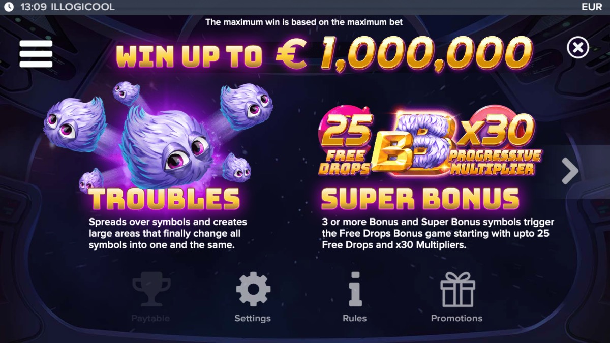 The slot includes Cascading wins, Cool Reel modifiers, Wilds and Locked Wilds, Monster Wilds, Troubles and Double Trouble features, Bonus and Super Bonus rounds, Extra Drop symbols, Win Multipliers, and the optional X-iter™ Feature Buy menu in eligible regions.