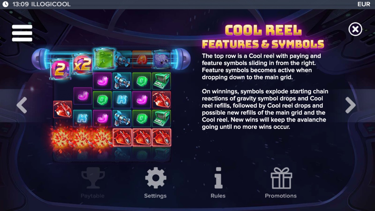 Cool Reel | Positioned above the grid, it contains regular and feature symbols that drop after a win streak, triggering modifiers. |