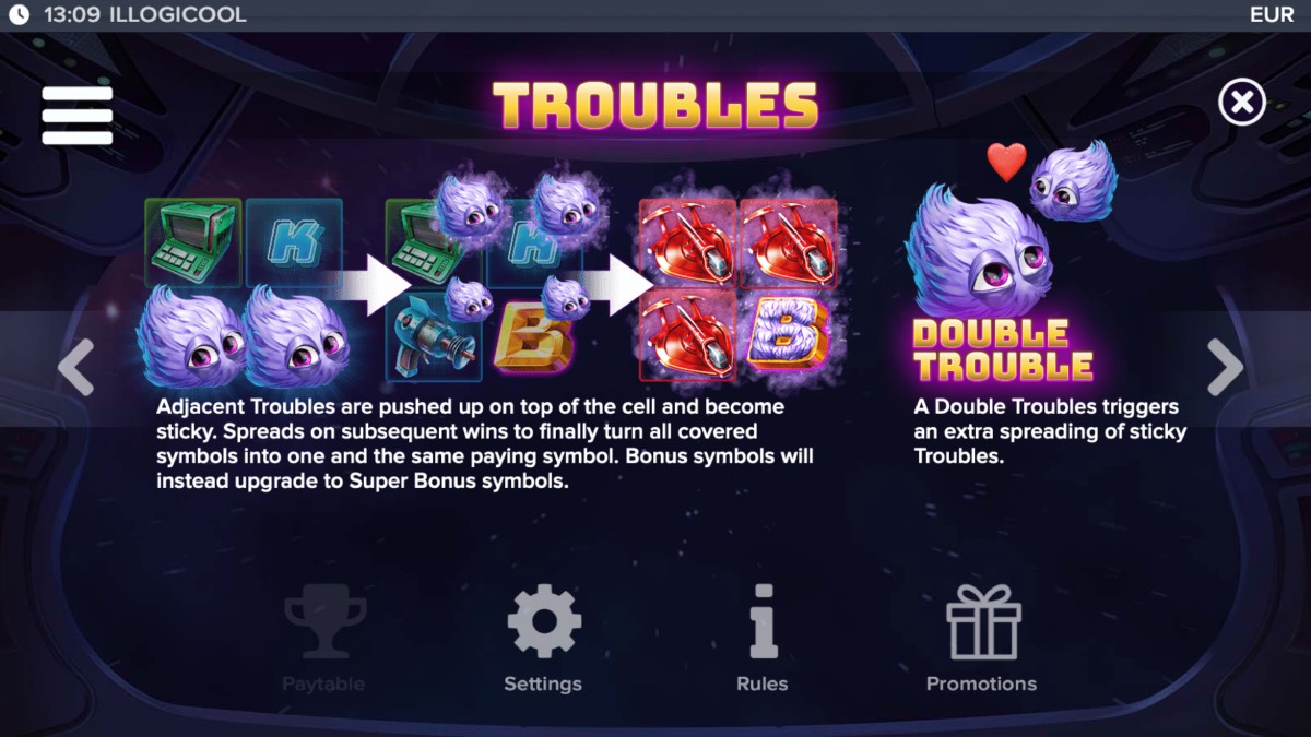 Troubles | Fluffy purple critters from the Cool Reel turn symbols into matching symbols, acting as a mystery symbol feature. |