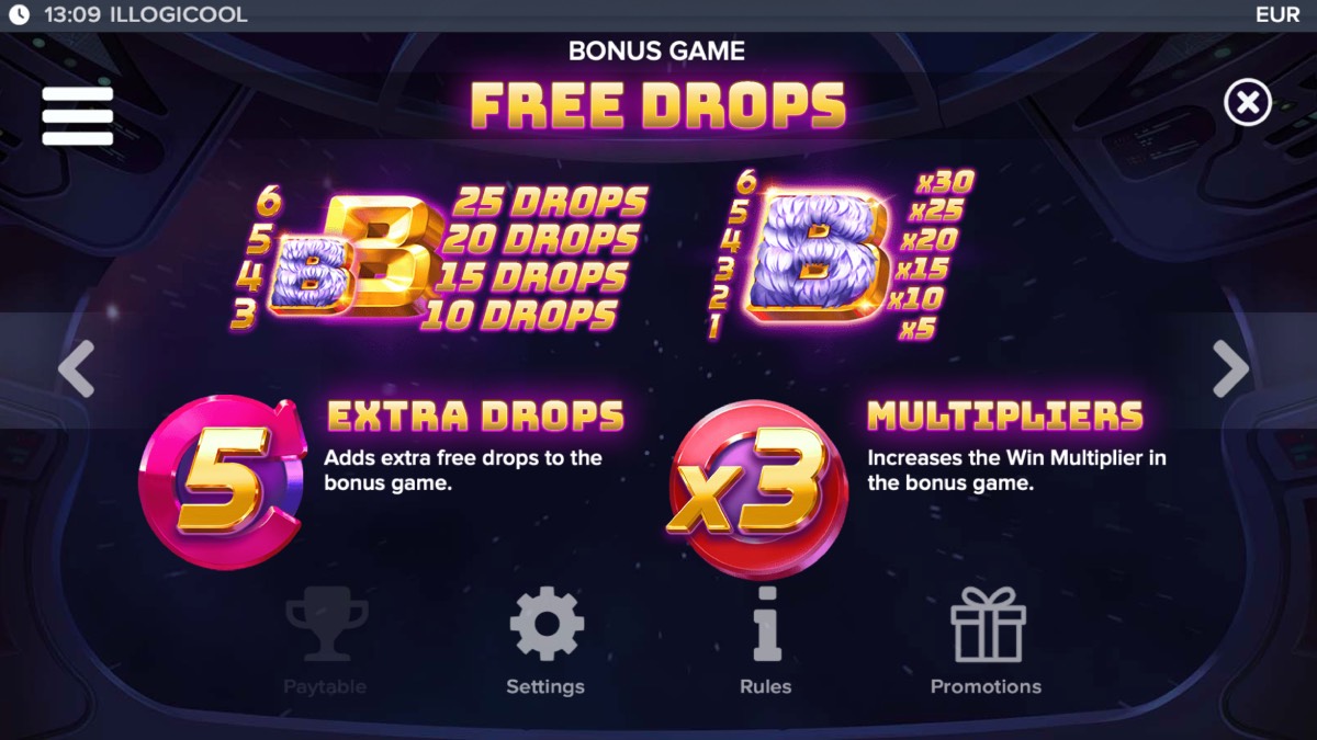 The slot’s free spins mode is triggered by landing 3 or more bonus or super bonus scatter symbols. Depending on the number of scatters, players receive between 10 and 25 free spins. During this mode, several mechanics enhance winning potential: additional symbols can appear on the Cool Reel, Extra Drop symbols award extra free spins, and Win Multipliersymbols increase the global multiplier by +1, +2, or +3 for all spins.