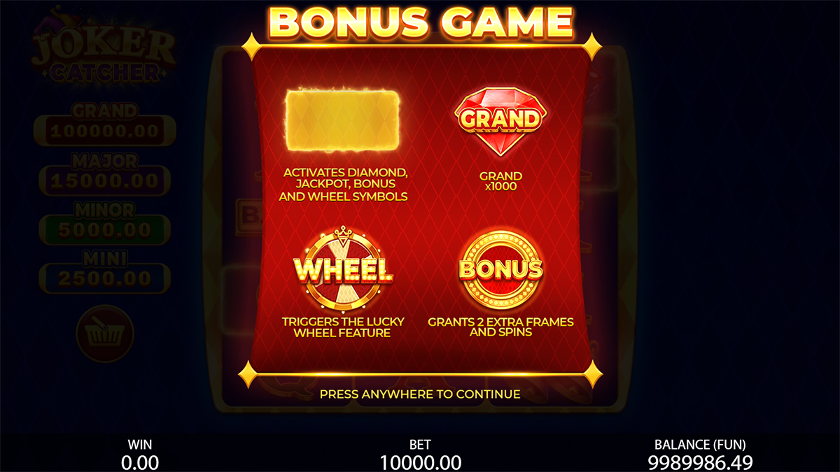 Special symbols are the backbone of Joker Catcher’s feature-driven experience, with the Joker Wild, Bonus symbol, Jackpot symbols, and Lucky Wheel trigger all playing essential roles. The Joker, permanently locked at the center, is the most important symbol, acting as both a Wild and a collector that instantly gathers rewards from Catch Frames. Bonus symbols unlock the Bonus Game, while Wheel symbols activate the Lucky Wheel for instant prizes or jackpot wins. Jackpot symbols feed directly into the game’s progressive jackpot system, adding long-term excitement. Together, these special symbols transform Joker Catcher from a standard slot into an interactive experience where features, upgrades, and escalating rewards drive gameplay.