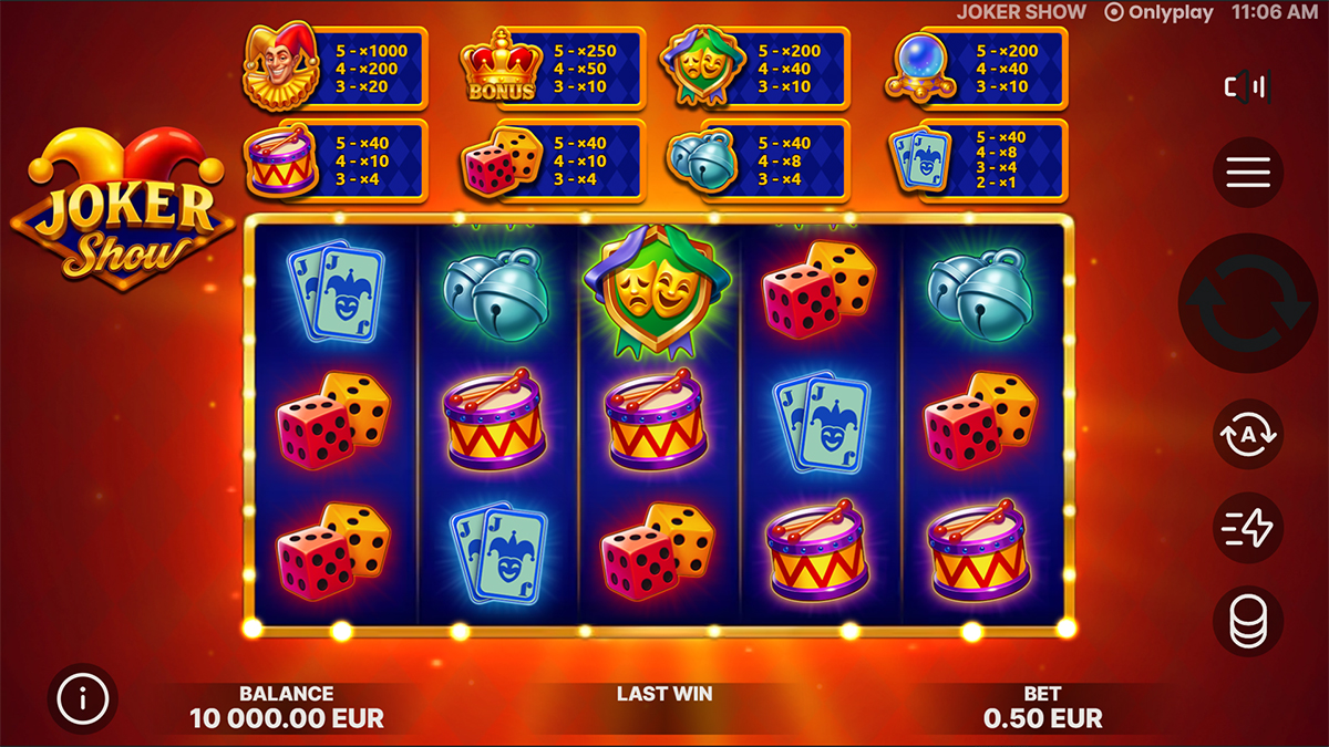 Onlyplay, the studio behind Joker Show, is known for crafting slots that combine bright visual energy with straightforward mechanics, allowing a wide range of players to enjoy fast gameplay without unnecessary complexity. Over the years, the provider has developed a reputation for favoring bold colors, clean interfaces, and accessible game math that caters both to casual players and to those who enjoy classic layouts with modern execution. Joker Show clearly reflects these design principles, showcasing Onlyplay’s ability to revive traditional fruity slots with contemporary polish while keeping the core gameplay experience uncomplicated, immersive, and rooted in the timeless pleasure of spinning reels.