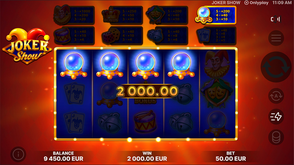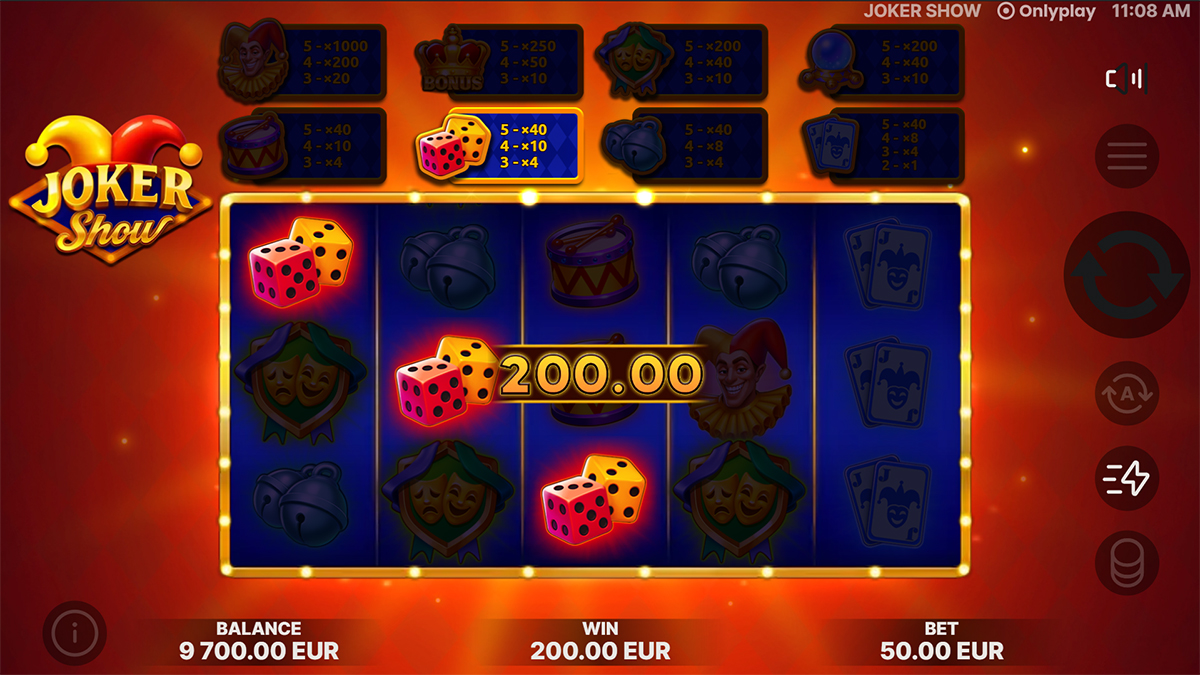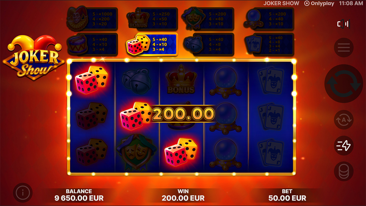 Joker Show features medium volatility, offering a balanced mix of consistent smaller payouts and occasional high-value hits. This makes the gameplay steady without eliminating the potential for exciting bursts of rewards. It’s an ideal volatility profile for players who prefer moderate risk with reliable pacing.
