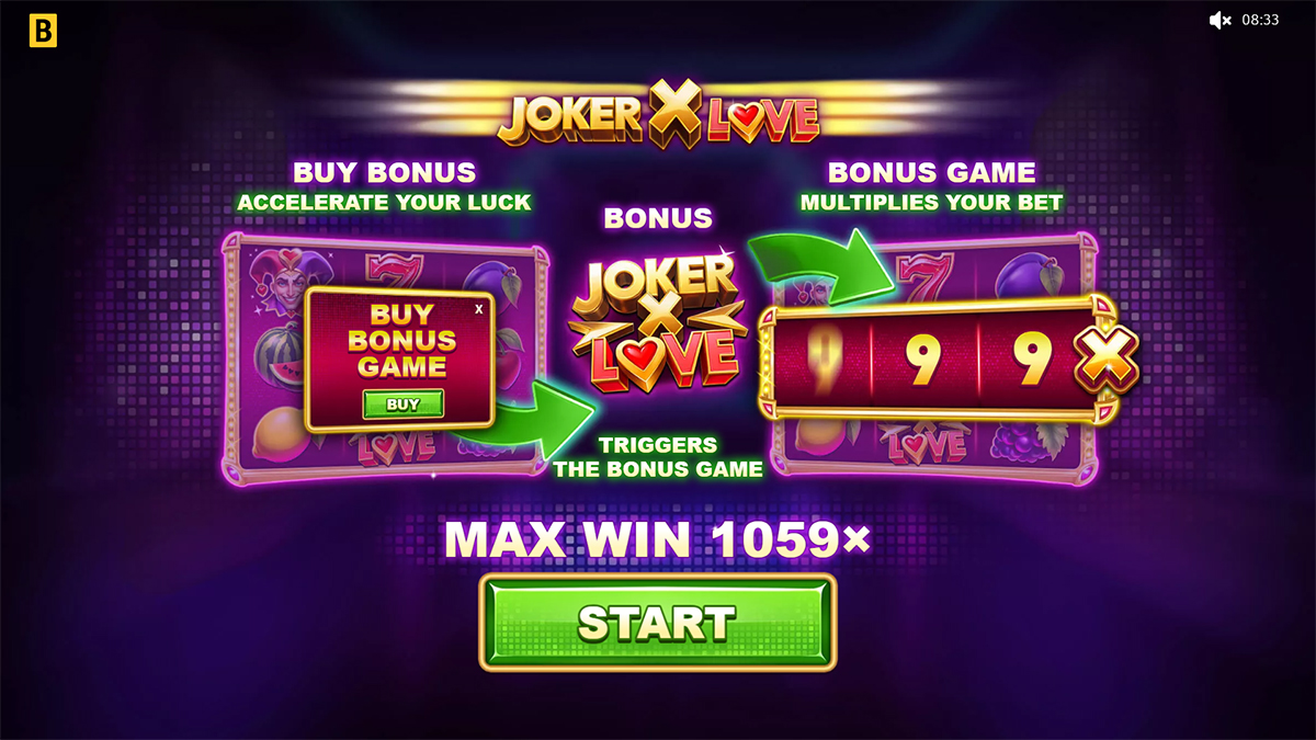 • Bonus Symbol – Three Joker X Love symbols on reels one to three trigger the Bonus feature.