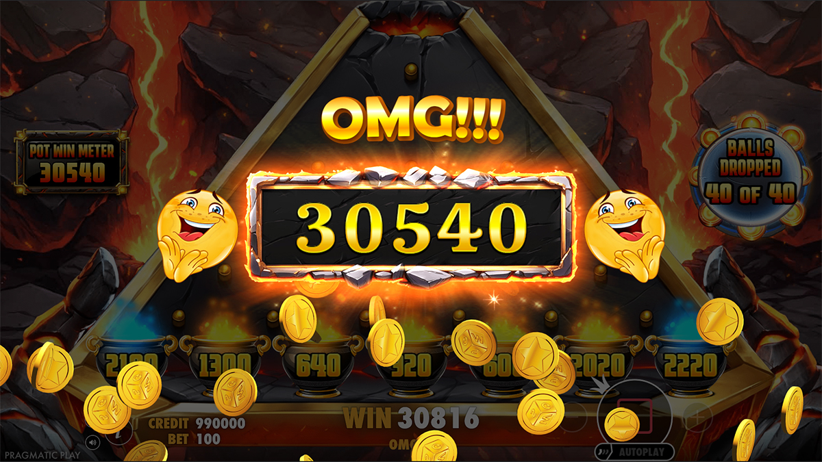 Activated by winning with Wilds; drops a lava ball into a pot containing multipliers or a Free Spins icon.