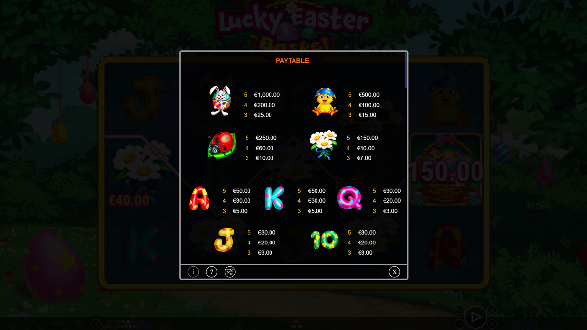 Lucky Easter Basket is designed to accommodate a very wide range of players by offering flexible betting limits. Typically, the minimum bet starts at a very accessible €0.20 per spin, which is perfect for casual players who want to enjoy the festive theme and the “Egg Hunt” mechanics on a smaller budget. On the other end of the scale, high rollers can increase their stakes up to a maximum of €100 per spin, depending on the specific limits set by the casino operator. This broad spectrum ensures that the game is inclusive, regardless of your bankroll size. All 20 fixed paylines are always active, so even at the minimum bet of €0.20, you still have the chance to trigger every feature and potentially hit the massive 10,350x maximum win. This balance makes it a versatile choice for a variety of betting strategies, from conservative long-play sessions to high-stakes hunts for the top jackpot.