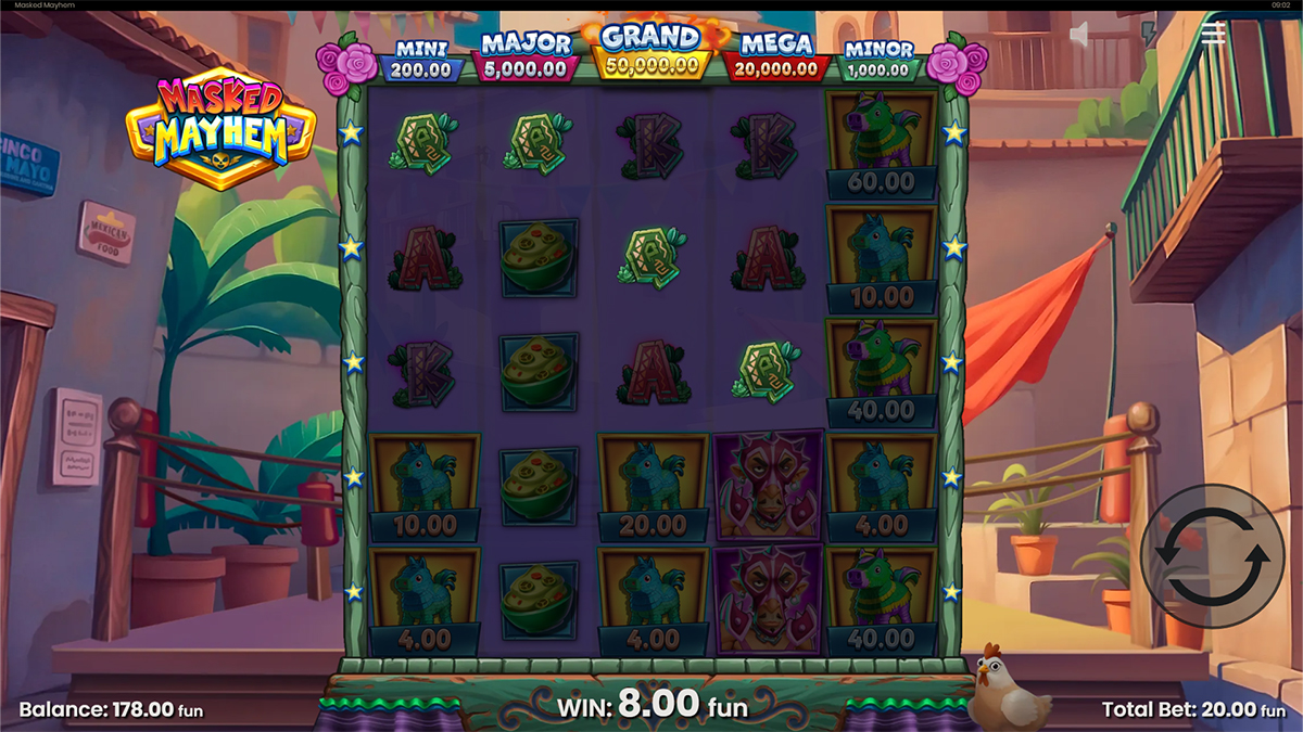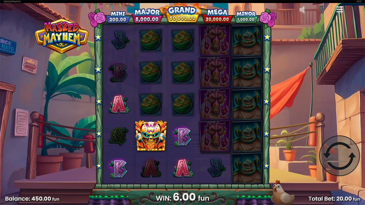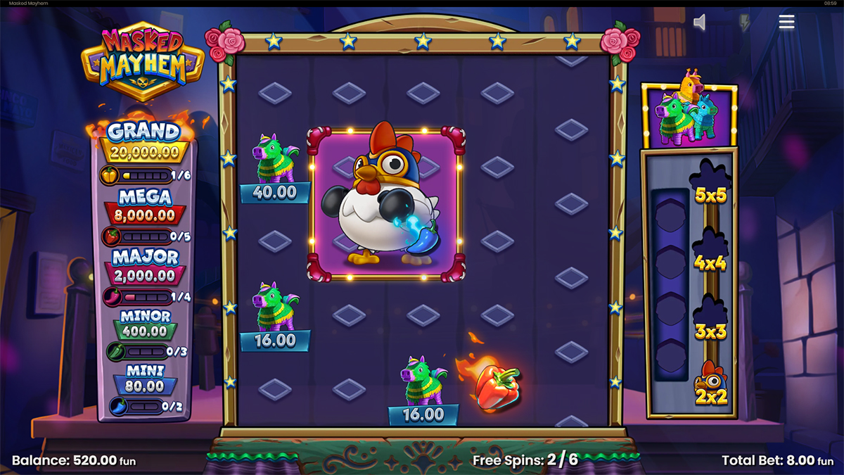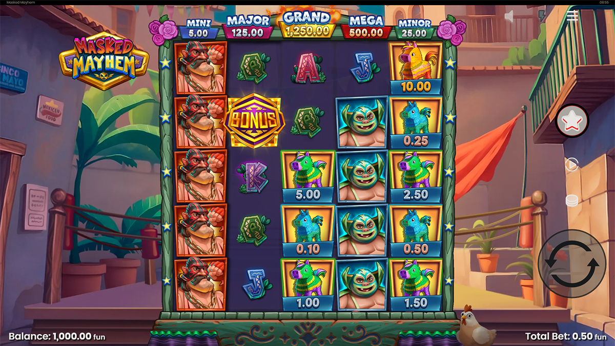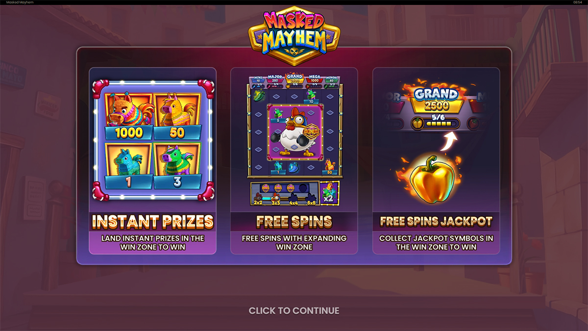 Keep an eye out for the colorful luchadores, as they are the highest-paying symbols and deliver the game’s biggest base wins. The Wild symbol also plays a crucial role, substituting for regular symbols to complete valuable combinations. Additionally, the Instant Prize and Jackpot symbols can unlock some of Masked Mayhem’s most lucrative rewards, especially during the Free Spins feature.