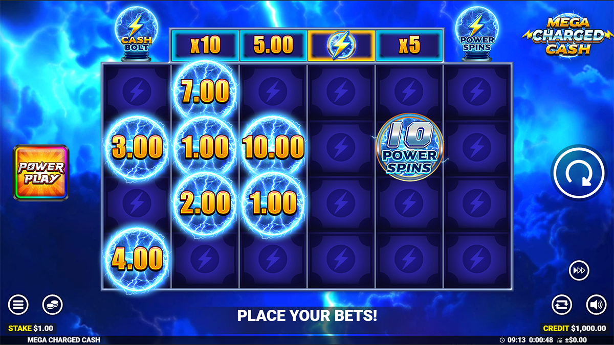 Mega Charged Cash offers a flexible betting range that accommodates both casual players and high rollers. The base bet starts at a low entry level, while the optional Power Play feature increases the total stake by 5x for a higher chance to trigger Power Spins. This allows for strategic risk management, where players can tailor their gameplay experience based on bankroll and volatility preference.