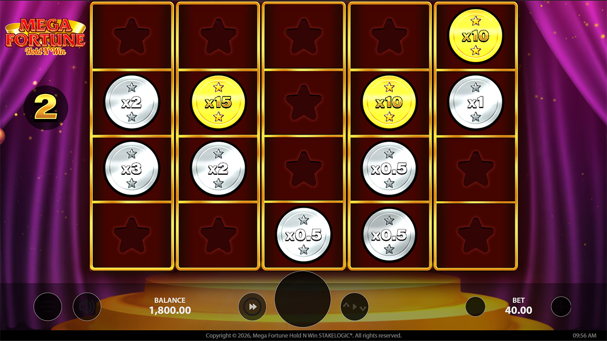 Mega Fortune Hold ‘N’ Win does not include a traditional Free Spins round. Instead, the game replaces free spins with the Hold ‘N’ Win bonus, which serves as the main feature-driven experience. This approach keeps the gameplay focused on coin collection and respin mechanics rather than extended spin sequences.