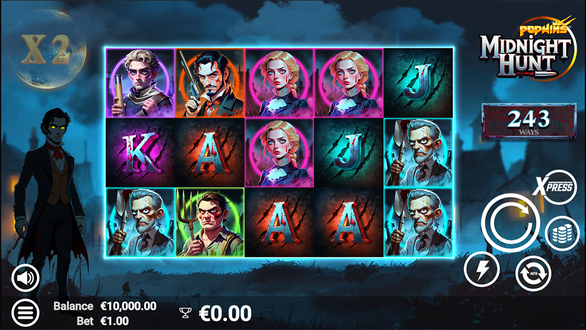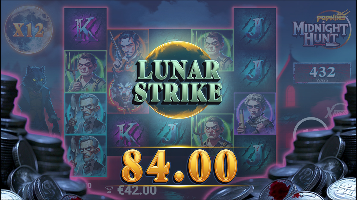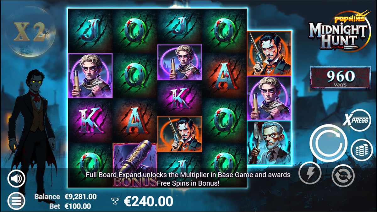 Midnight Hunt features four main mechanics that elevate gameplay intensity and reward potential. The PopWins system continuously expands reels with every win, creating a sense of endless momentum. The Multiplier Unlock adds an extra layer of strategy by activating and increasing multipliers tied to reel expansion. Finally, the Free Spins and Feature Buy options give players greater control, allowing direct access to the most rewarding parts of the game.