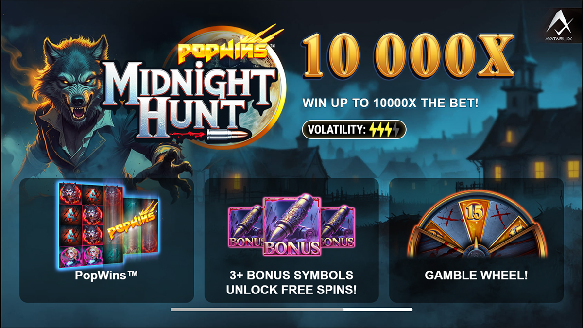 Midnight Hunt by Avatar UX stands out as a masterfully crafted slot that blends gothic horror, thrilling mechanics, and substantial winning potential into one captivating experience. The game captures the essence of a dark, haunted village under siege, immersing players in an atmosphere of suspense and danger with every spin. From its hauntingly beautiful visuals and eerie soundtrack to the innovative PopWins system and generous max win of 10,000x, every element feels purposefully designed to heighten immersion and excitement. The Free Spins feature serves as the core of the gameplay, where progressive multipliers and expanding reels combine to deliver thrilling moments of anticipation and reward. High volatility adds to the intensity, ensuring that while wins may not occur frequently, they are impactful when they do. Midnight Hunt successfully balances cinematic storytelling with deeply engaging slot mechanics, creating an experience that will appeal to both fans of dark fantasy and players seeking high-risk, high-reward gameplay. It’s a title that demands courage, patience, and strategy—qualities that align perfectly with its theme of surviving the night against supernatural forces.