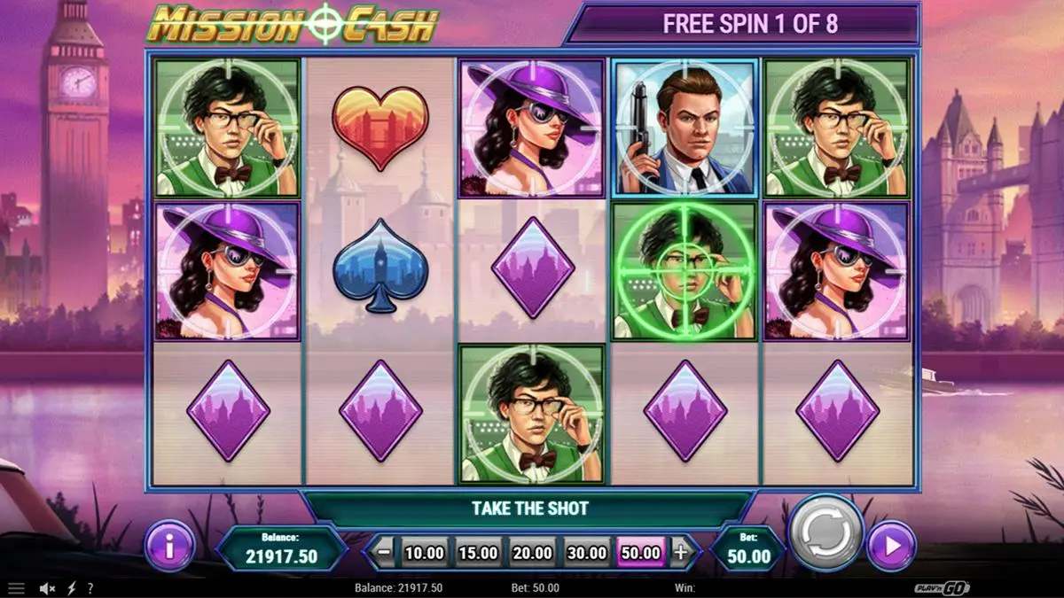 The core structure of Mission Cash is built on a standard 5-reel, 3-row layout with 20 fixed paylines, but the feel is anything but standard. What elevates the base game above the average is the presence of the Wandering Crosshair, a target that floats over the reels during every spin. When it locks onto a symbol—particularly Agent Blue or Agent Red—you enter the Take the Shot sequence, which expands the agent into a full-reel wild and triggers a respin, holding the expanded wild in place. This sequence can repeat across multiple reels, meaning that with a bit of luck (and good targeting), you can fill the screen with wilds. Standard spins become action-packed the moment the Crosshair gets involved, with every position on the reel grid feeling like a potential trigger point. The agents themselves function as high-paying symbols, and it’s in these layered mechanics—standard spin + Crosshair + expansion + respin—that the base game becomes intensely strategic. It’s less about spinning mindlessly and more about watching the reels for the right combination of agent placement and crosshair targeting.