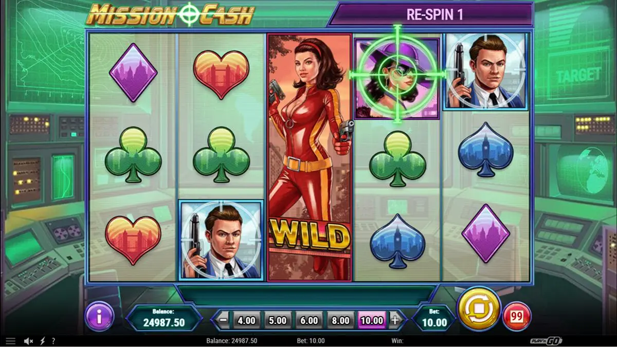 The maximum win in Mission Cash is 5,000x your stake. This potential is most realistically reached during the Free Spins round when the Wandering Crosshair lands repeatedly on high-value agents, creating fully stacked wild reels.