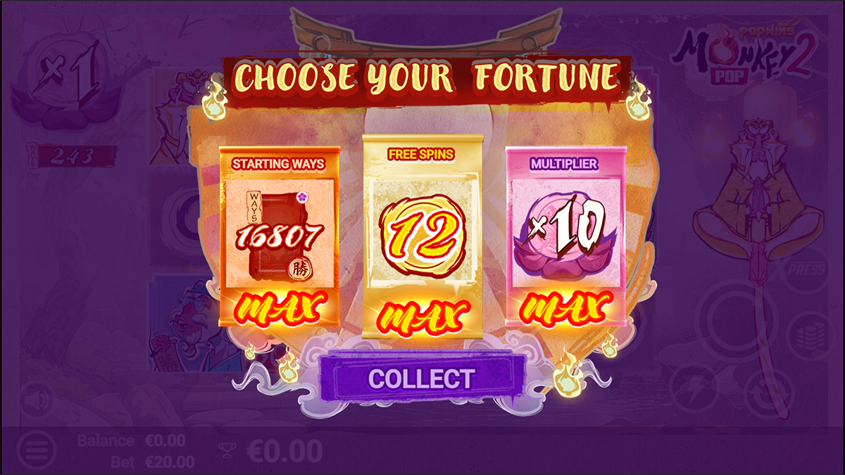 Special symbols in MonkeyPop 2 include the Scatters depicted as a glowing flame within a Torii gate, symbolizing enlightenment and entry into the sacred bonus realm. Scatters are the key to unlocking the Bonus Game, which opens the door to free spins, enhanced reel heights, and higher multipliers. During free spins, special enhancements may also include randomly added Wilds or instant filling of the Bonus Collector, providing extra spins and expanding the session’s potential. These special symbols embody the gateway to deeper rewards and serve as core catalysts for unlocking the slot’s most profitable and dramatic moments.