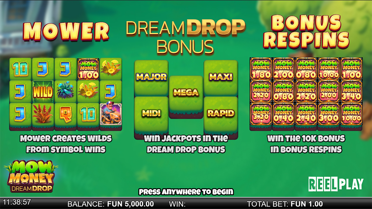 Mechanically, Mow Money Dream Drop operates with precision and fluidity, building on ReelPlay’s proven foundation of cascading wins and sticky symbol respins. The cascading mechanic ensures that every win is a potential chain reaction — winning combinations disappear, new symbols fall into place, and Wilds are randomly introduced to boost the next spin’s potential. The 243 ways to win ensure that paylines aren’t a limitation; instead, any left-to-right combination can lead to payouts, amplifying the excitement of every spin. The 10K Bonus mechanic ties into the game’s high volatility, giving lucky players the chance to reach the massive 10,000x potential. During Bonus Respins, Scatter and Lawnmower Man symbols interact in clever ways — the mower collects values, resetting respins and maximizing the player’s winnings. The integration of the Dream Drop Jackpot layer adds a separate level of anticipation, randomly activating and allowing access to one of five progressive jackpot tiers. Altogether, the mechanics create a seamless experience where potential and playability harmonize beautifully.