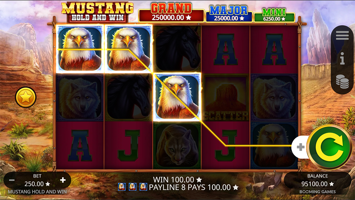 Mustang Hold and Win features 25 fixed paylines that are active on every spin. These paylines create consistent structure and make it easy for players to understand how winning combinations form. Because they remain fixed, every bet always covers all available paylines to maximize hit potential.