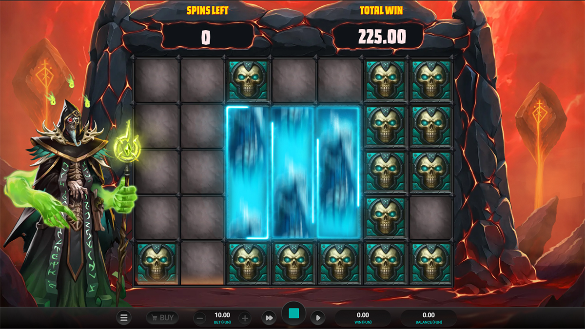 The gameplay of Necromancer’s Gate is built around a traditional 5-reel, 4-row layout supported by 20 fixed paylines, offering a familiar structure enhanced by highly dynamic bonus interactions. Players place their bets and spin to match symbols from left to right across adjacent reels to trigger base game wins, while remaining alert for special symbols that can activate unique features. The flow of gameplay is intentionally suspense-driven, with visual effects, atmospheric sound design, and sudden feature triggers creating unpredictable momentum shifts. Standard spins can quickly evolve into high-impact bonus events, especially when cursed skulls, scatters, or ghoul activators appear. This layered design ensures that even standard rounds remain engaging, while extended bonus sequences offer opportunities for dramatic payout escalations.