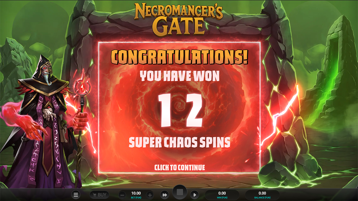 Yes, Necromancer’s Gate includes a Free Spins feature known as Chaos Spins. This bonus round is triggered by landing three or more Scatter symbols during base gameplay or through Mystery Respin reveals. During this mode, enhanced multipliers and Ghoul Activators significantly increase payout potential.