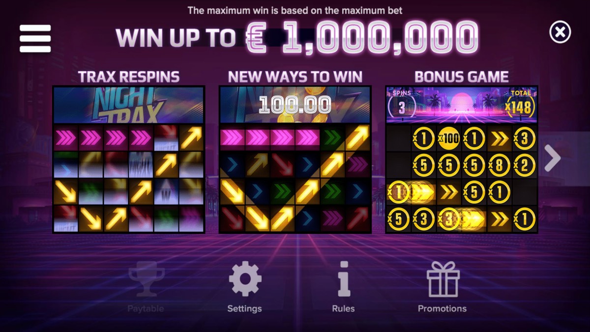 Night Trax stands out as a visually captivating slot that successfully blends fast-paced mechanics with strategic depth. The diagonal paylines and arrow-linked multipliers create a unique layer of gameplay, rewarding careful observation and planning. The X-iter™ feature adds flexibility, allowing players to adjust risk levels according to preference, which is particularly appealing for experienced gamers. Its neon aesthetic and clean design enhance both clarity and immersion, making the game easy to follow even during intense sessions. While it may not suit players seeking frequent small wins, Night Trax offers a compelling, modern slot experience that rewards patience and strategic play.