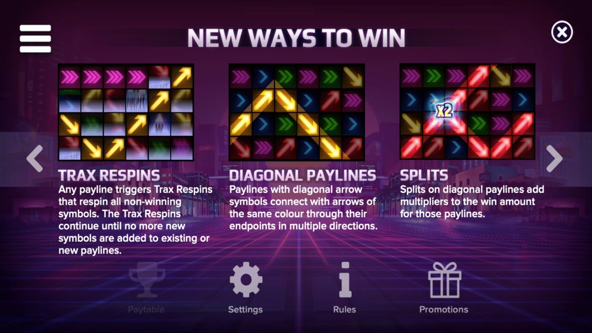 Key features include Trax Respins, Split Multipliers, a multiplier-collecting bonus game, diagonal paylines, and the X-iter™ mode with five different gameplay options.