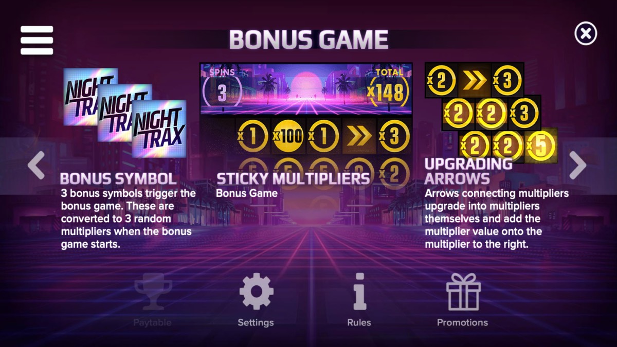 Night Trax does not have a traditional free spins mode in the usual sense. Instead, its closest equivalent is the multiplier-collecting bonus game, which is triggered by landing 3 bonus symbols. In this mode, players continue spinning while collecting multipliers that appear on the reels. Arrows connect these multipliers diagonally, transferring values to adjacent symbols and adding to potential wins. The feature essentially extends gameplay in a way similar to free spins, but with the added strategic element of multiplier collection, allowing for larger and more dynamic payouts compared to standard spins.