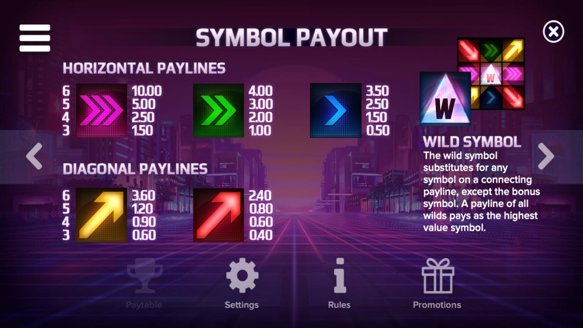 Players should watch the neon-themed symbols, which include standard letters and numbers as well as higher-value icons, all designed to stand out against the glowing, futuristic backdrop.