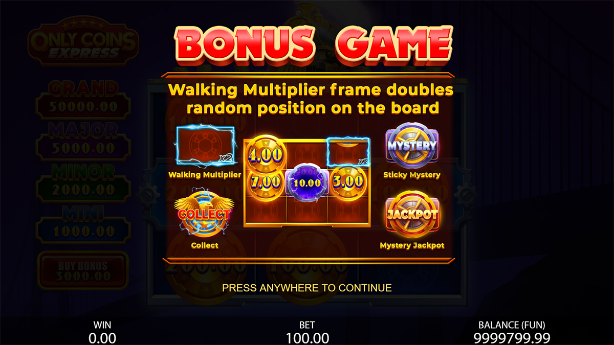 Special symbols in Only Coins Express introduce depth and excitement to the slot’s mechanics. The Sticky Mystery symbol, for example, stays locked on the reels once it lands and persists until the end of the Bonus Game, revealing values up to 50x the total bet. The Mystery Bonus symbol, on the other hand, can unveil one of three special wins—10x, 20x, or 50x the bet. The Collect symbol operates as a powerful accumulator, gathering the total value of all symbols on the reels and occasionally doubling it when paired with the Walking Multiplier. These special icons drive the core excitement of the game, transforming every spin into an opportunity for major returns.