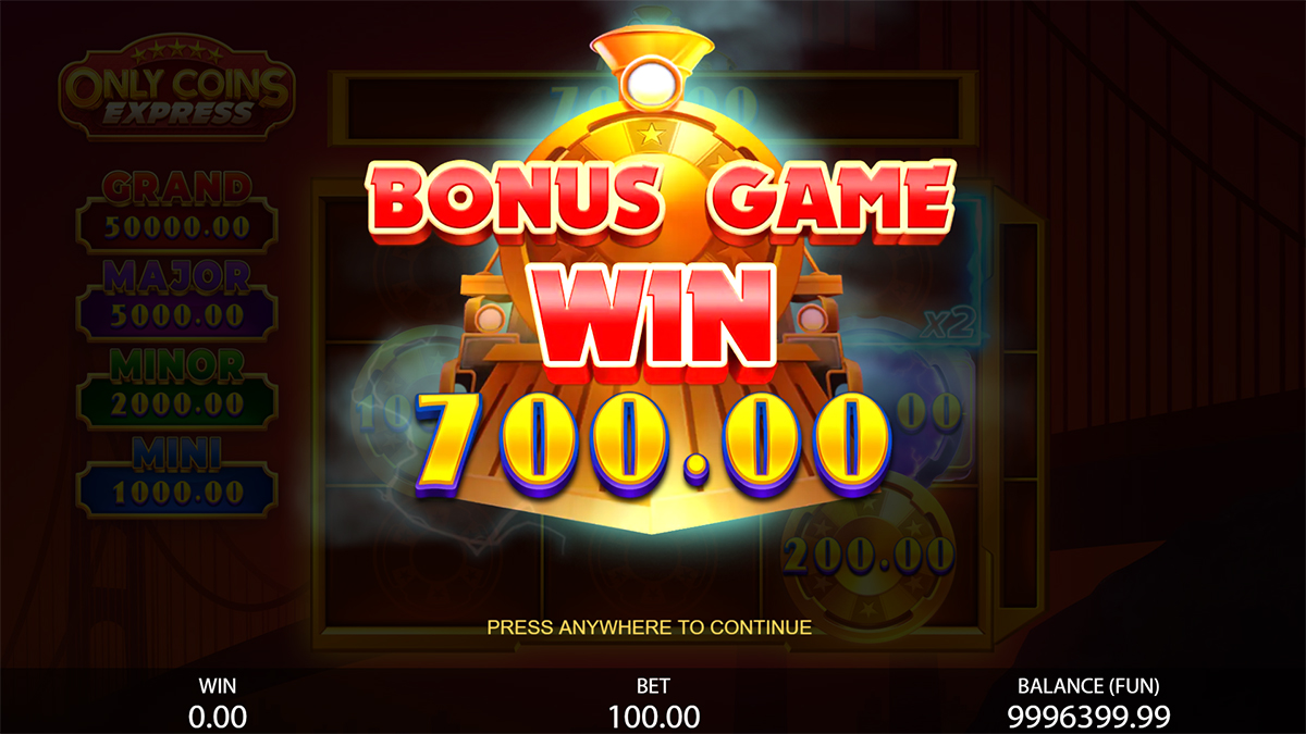 Only Coins Express does not include a traditional Free Spins feature but instead offers a Bonus Game that functions as the main reward mechanic. Triggered by landing three Bonus symbols or activating the Heap of Coins feature, this mode awards 3 respins with resetting opportunities. The Bonus Game delivers a thrilling and interactive alternative to free spins, emphasizing symbol accumulation and multiplier rewards.